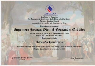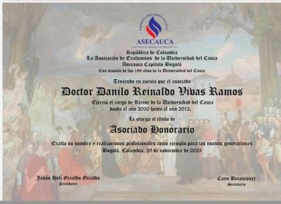 El 29 de noviembre de 2023 se realizó en el club de la FAC la ceremonia de entrega de Diploma de Reconocimiento a los Asociados Honorarios, de acuerdo con los Estatutos de Asecauca y en cumplimiento a lo aprobado en asamblea general de egresados celebrada el día 29 de marzo de 2023, en la cual se aprobó en forma unánime el reconocimiento como Asociado Honarario a los exrectores de la Universidad del Cauca Danilo Reinaldo Vivas Ramos y Otoniel Fernández Ordóñez, y al Secretario general del Senado Gregorio Eljach Pacheco
