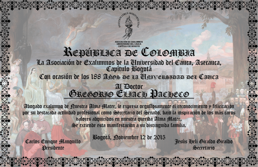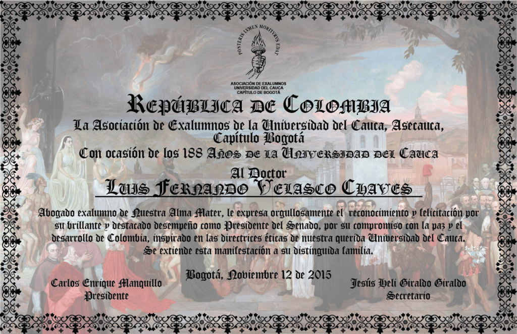 Exalumno de la Universidad del Cauca, presidente del Senado de la república de Colombia. Le expresa orgullosamente el reconocimiento y felicitación por su brillante y destacado desempeño en las responsabilidades públicas, la política y su compromiso con la paz y el desarrollo de Colombia, inspirado en las directrices éticas de nuestra querida Universidad del Cauca.