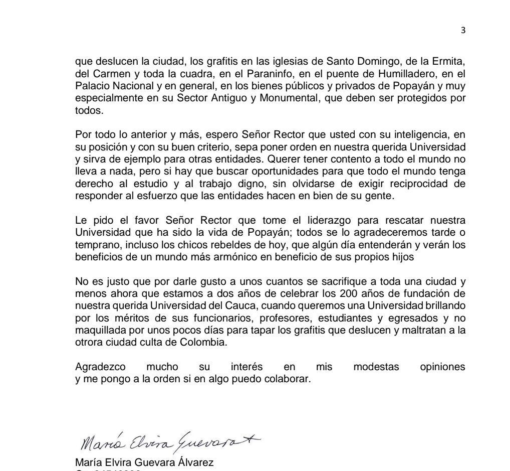 Carta de la ingeniera María Elvira Guevara al rector de Unicauca