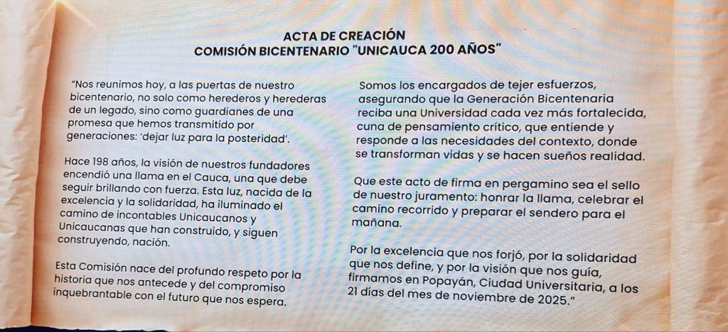 El 21 de noviembre de 2025 constituye una fecha memorable para la historia de la Universidad del Cauca, representada en todos sus estamentos. Por convocatoria del rector, Déibar René Hurtado, nos reunimos en el Claustro Santo Domingo con lleno total del majestuoso Paraninfo Francisco José de Caldas y áreas adyacentes, todos los estamentos universitarios con gran participación de estudiantes, profesores, personal administrativo y autoridades municipales. Celebramos 198 años de historia de nuestra alma mater. Además, los representantes del Consejo Superior Universitario, exrectores y el presidente de Asecauca capitulo Bogotá, firmamos, en un acto de la mayor trascendencia el Acta de creación de la Comisión Bicentenario UNICAUCA 200 AÑOS. Con nuestra firma sellamos un compromiso inviolable de fijar la Hoja de ruta del Bicentenario, tenemos dos años para hacer honor a este máximo desafío.