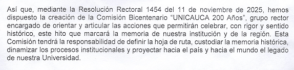 Extraído de la Comunicación de Rectoría Unicauca 2-55-6/1018. Popayán, nov 13 de 2025