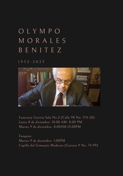 La junta directiva de la Asociación de exalumnos de la Universidad del Cauca, Asecauca capitulo Bogotá lamenta la muerte de su Asociado Adherente Olympo Morales Benítez y expresa el sentimiento de solidaridad con su esposa Telma, sus hijas Daniela y Luisa, sus nietos, su hermana Adela, familiares y amigos. Compartimos su dolor porque su vacío es difícil de llenar por sus valiosos aportes intelectuales, su apoyo y compromiso y su gran sentido de la amistad, qepd