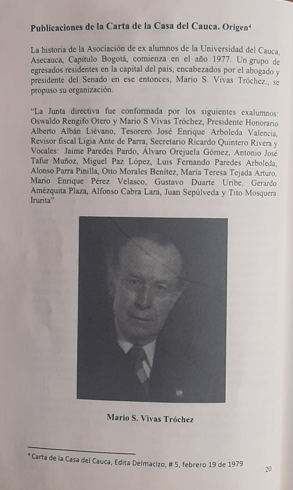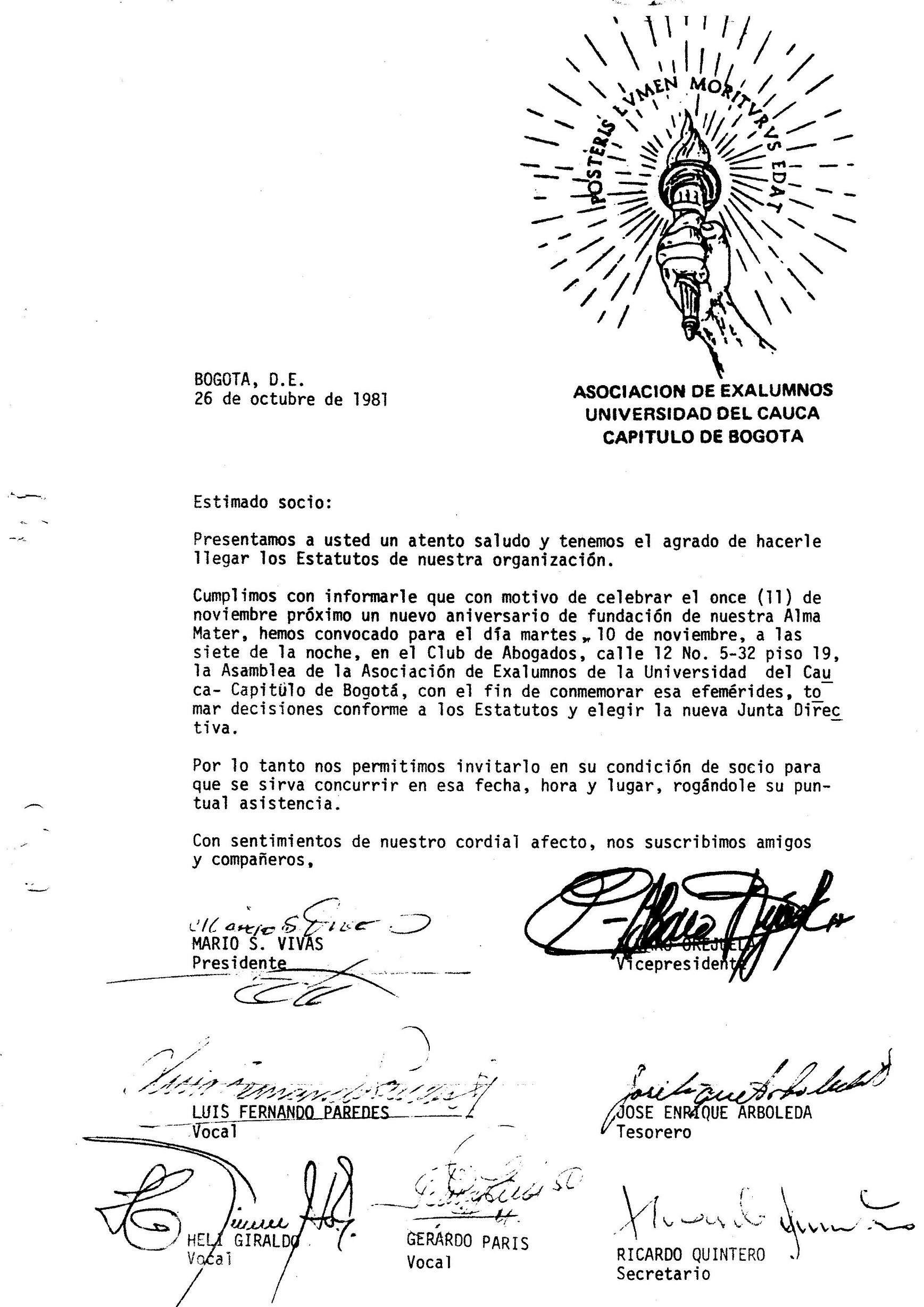 “La Junta directiva fue conformada por los siguientes exalumnos: Oswaldo Rengifo Otero y Mario S Vivas Tróchez, Presidente Honorario Alberto Albán Liévano, Tesorero José Enrique Arboleda Valencia, Revisor fiscal Ligia Ante de Parra, secretario Ricardo Quintero Rivera y Vocales: Jaime Paredes Pardo, Álvaro Orejuela Gómez, Antonio José Tafur Muñoz, Miguel Paz López, Luis Fernando Paredes Arboleda, Alonso Parra Pinilla, Otto Morales Benítez, María Teresa Tejada Arturo, Mario Enrique Pérez Velasco, Gustavo Duarte Uribe, Gerardo Amézquita Plaza, Alfonso Cabra Lara, Juan Sepúlveda y Tito Mosquera Irurita