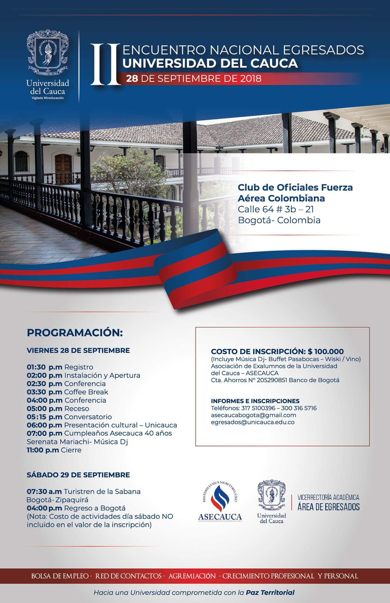 Los egresados de la Universidad del Cauca hemos sido convocados, por nuestra Alma Mater y Asecauca Bogotá, para encontrarnos en la capital del país el próximo 28 de septiembre de 2018, a la 1:30 de la tarde, en el club de la fuerza aérea colombiana FAC.