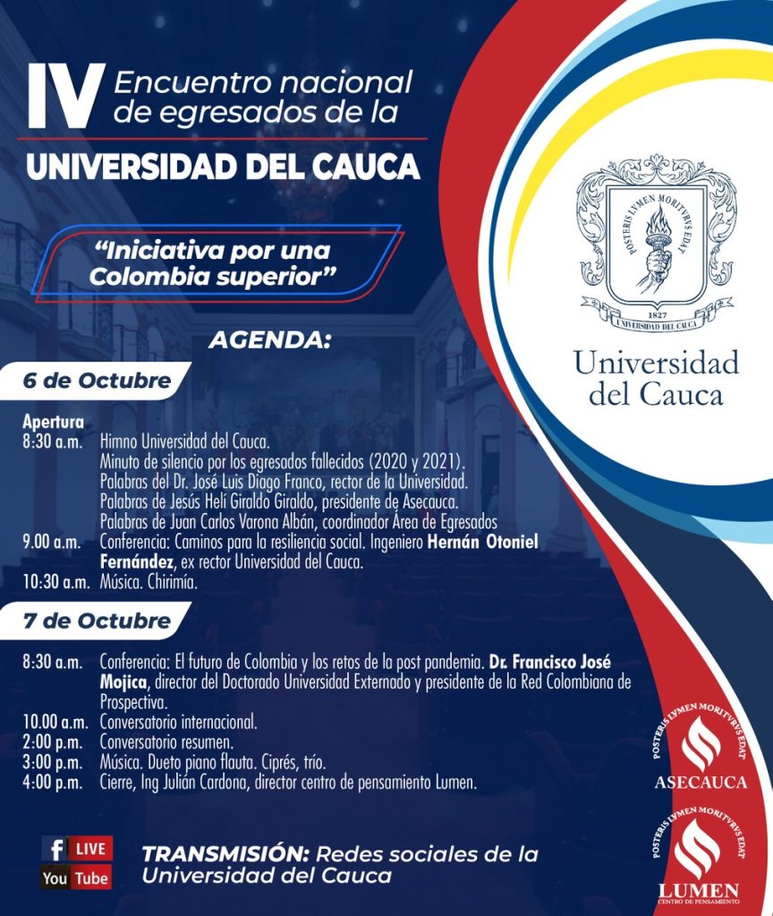 El IV encuentro nacional de egresados unicaucanos, Iniciativa por una Colombia superior, realizado en forma virtual durante los días 6 y 7 de octubre de 2021, organizado por la Asociación de exalumnos, Asecauca Capítulo Bogotá conjuntamente con la Universidad del Cauca y el centro de pensamiento Lumen, deja una serie de reflexiones de gran repercusión en el futuro de la Universidad, de la educación superior y su incrustación en el engranaje del desarrollo económico social y en el campo académico.