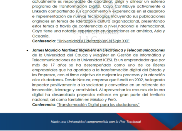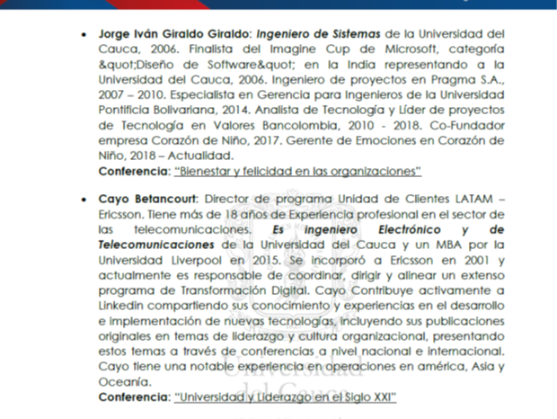 Gracias a los conferencistas: Gloria Viveros con el tema Egresados capaces, James Martínez con Transformación digital para los ciudadanos, Jorge Iván Giraldo con Bienestar y felicidad en las organizaciones, Cayo Betancourt con Universidad y liderazgo en el siglo XXI. Y a Camilo Cifuentes con su show Cordialmente imitados, recargado, fue extraordinario. Yo participé con el Conversatorio Inteligencia emocional y convivencia. Gracias a las personas y empresas que patrocinaron el evento, sin ellas no hubiera sido posible.