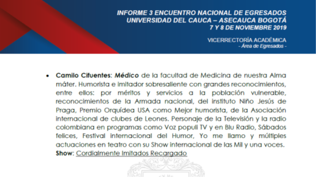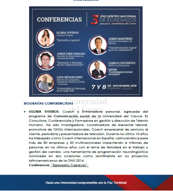 Haber participado en el tercer encuentro nacional de egresados de la universidad del Cauca, celebrado en Popayán durante los días 7 y 8 de noviembre de 2019, fue una de las más gratas experiencias que he tenido desde mi graduación como ingeniero civil en ésta, nuestra Alma mater.