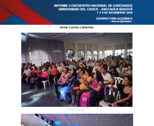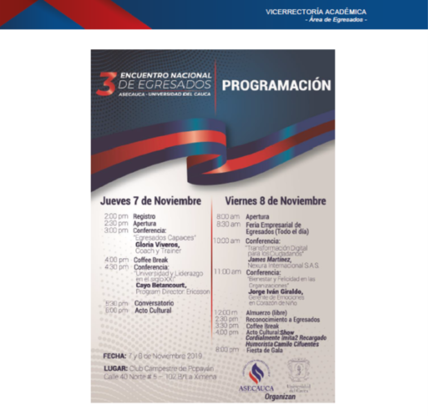 Con asistencia de más de 170 egresados unicaucanos se celebró en Popayán el Tercer Encuentro Nacional de Egresados, durante los días 7 y 8 de noviembre de 2019. El evento fue organizado por Unicauca a través del Área de Egresados en cabeza de Juan Carlos Varona Albán y la oficina de Comunicaciones, y Asecauca Capítulo Bogotá coordinada por Carlos Manquillo, Julián Cardona y Jesús Helí Giraldo. Además de las conferencia y otros actos programados se hizo entrega de Reconocimiento a los egresados: Hernán Otoniel Fernández Ordóñez, Camilo Cifuentes, Ligia Ante y Alonso Parra Pinilla, y homenaje póstumo a la egresada Esmeralda Arboleda Cadavid.